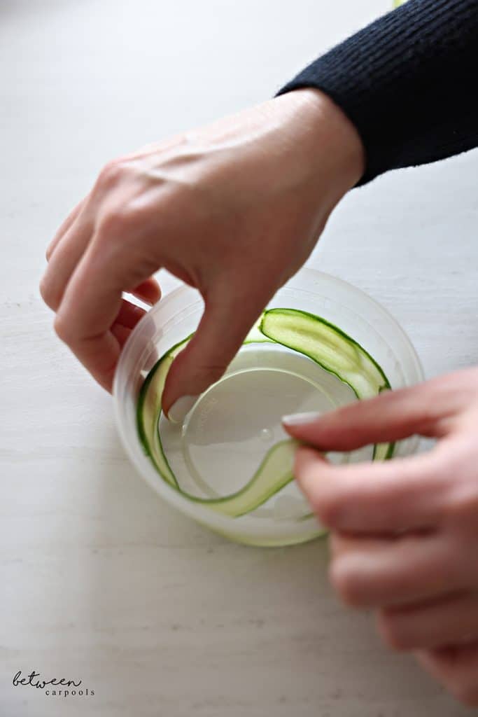 - Using a peeler, carefully peel long ribbons of cucumber. Place 2-3 ribbons of cucumber in 3 deli containers, overlapping the ribbons to form a ring along the whole container.