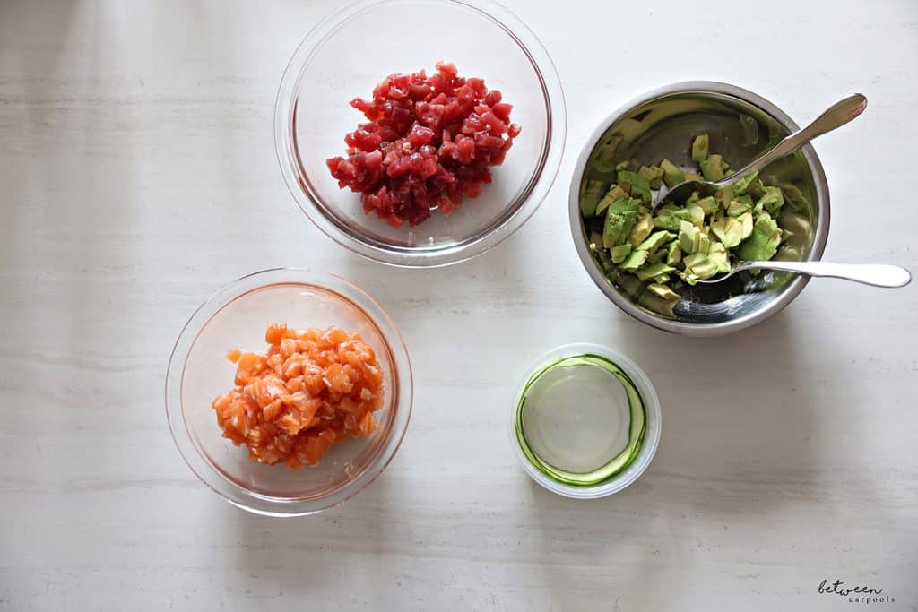 - Season both the tuna and the salmon with a tablespoon each of olive oil and some salt to taste (about ¼ tsp). Season the cubed avocado with only salt.