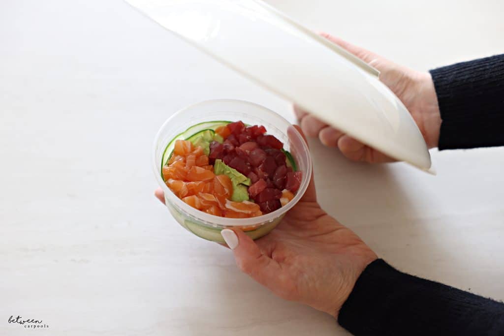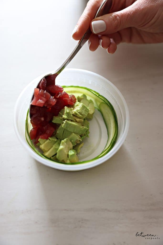- Place the cubed avocado in the center of the container, leaving room on either side. With the help of a spoon, fill one side of the container with tuna and the other side with salmon, pressing down so it’s tightly packed.