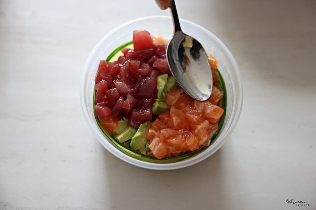 Place the cubed avocado in the center of the container, leaving room on either side. With the help of a spoon, fill one side of the container with tuna and the other side with salmon.