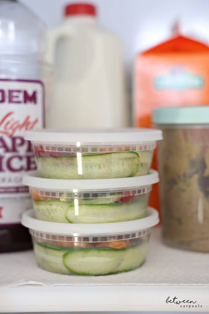 Place 2-3 ribbons of cucumber in 3 deli containers, overlapping the ribbons to form a ring along the whole container.