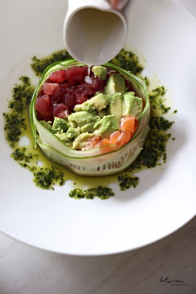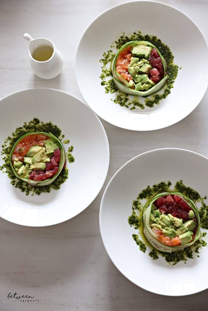 This recipe yields 3 gorgeous plates. We like to serve all three on the table as a shared appetizer (one plate is too big for one person; each one of these feeds about 2 people. Also, there may be a few people at the table who don’t like raw fish.)