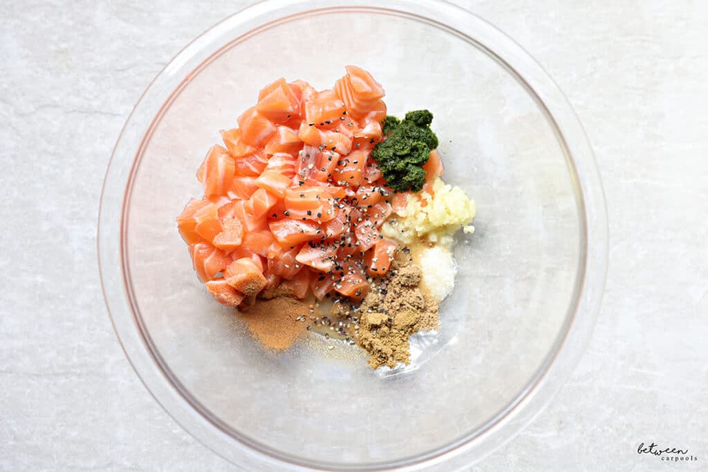 Combine all the ingredients, from the little itty bitty salmon cubes down through the spices.