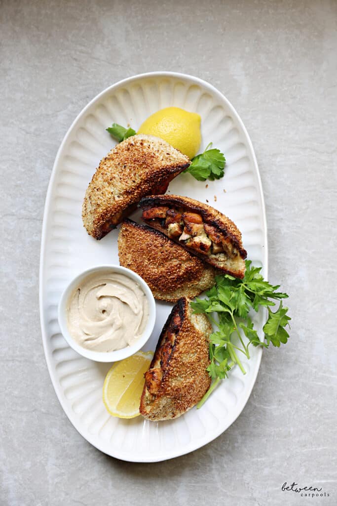 - We aren’t publishing a recipe for classic beef arayes because that’s already been around (Shifra Klein shared some BBQ-Flavored Arayes on BCP over here). However, if you do want to make amazing beef arayes, I’ll give you all the tips right here. One, use this recipe. Two, use a combination of ground lamb and/or beef/veal. Three, as far as quantity of meat, you’ll need 1 ½ lbs of ground meat for a double recipe that fills 6 mini pitas (12 halves). Four, as far as cooking method–in this recipe, I used a saute pan because I didn’t want to use my grill pan for fish. For the beef version, use your grill pan. Drizzle the Arayes generously with olive oil (this is what makes the difference between dry vs. amazing arayes). Heat pan and grill on both sides until you have nice grill marks. Then, transfer the pan to the oven for a few more minutes 5-8 more minutes (350⁰F is fine). You won’t be able to get them fully cooked on the inside without charring the bread if you keep them on the grill pan.