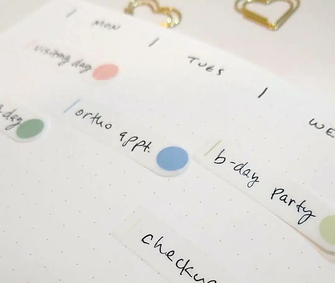 On the main schedule, use sticky tabs to put down all of the things you need to get done. The best part about using colorful sticky tabs is that you can color code the tabs according to the child or category. Put down the things that need to get done in the morning at the top, and the things that are for later in the day towards the bottom. This schedule is super flexible, because if any appointments or events move around, all you have to do is move the sticky tab to its new location. If your tabs are transparent (mine are), you can layer them on top of each other when you have several things happening at the same time of day.