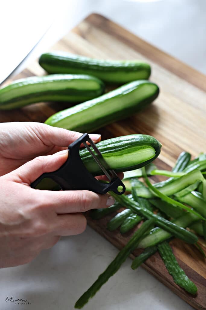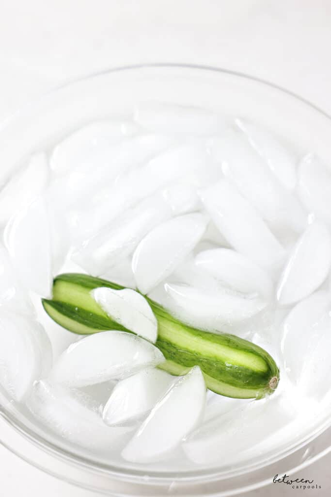 - Prepare the cucumbers. Peel a strip on three sides (optional, for decorative purposes). Soak in ice water for 20 minutes. Remove from ice water.