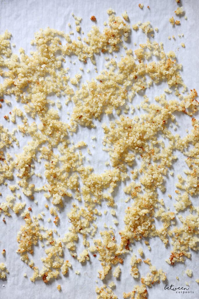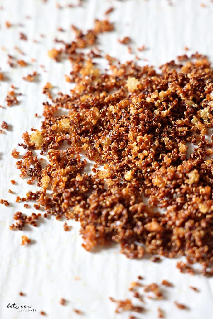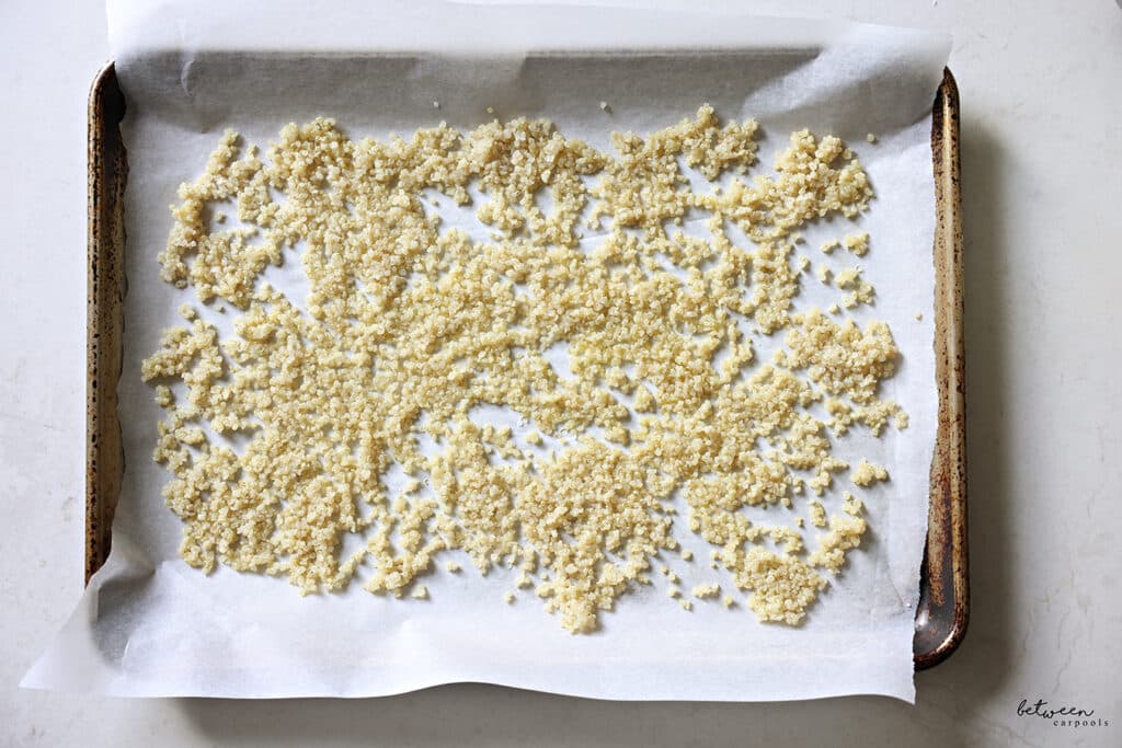 We made our crunchy quinoa by simply tossing 1 cup cooked quinoa