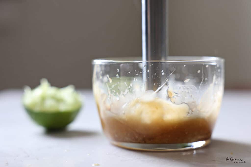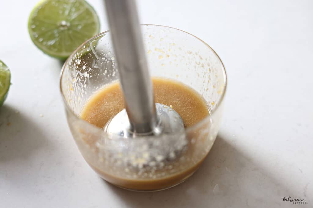 The dressing does have a couple steps, but you can do this ahead. (The original recipe was 3x this amount, but we cut down since we’re not making this in bulk. Note that it is easier to emulsify a larger quantity of dressing).
