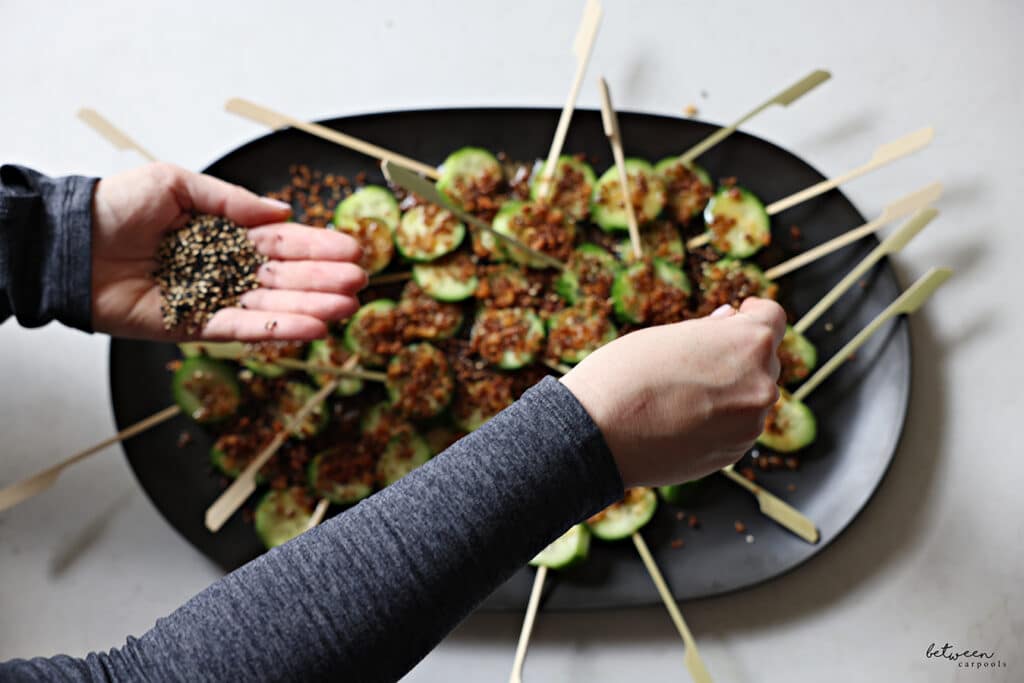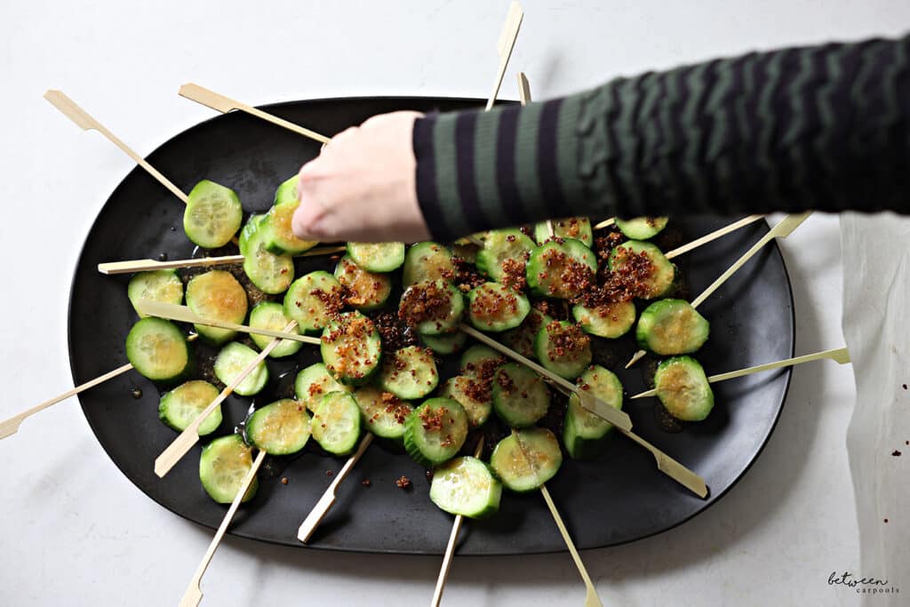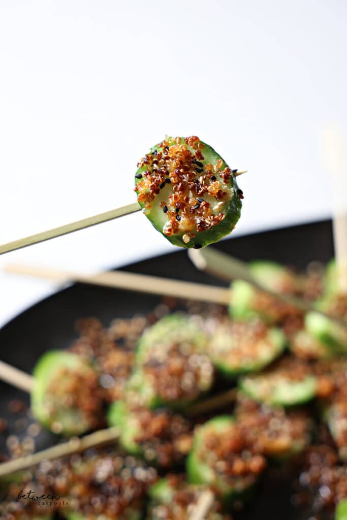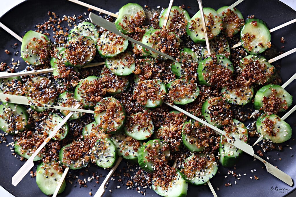 - Slice cucumbers on a bias, insert skewers, and arrange on a platter. Spoon dressing on top and top with fried quinoa and sesame seeds.