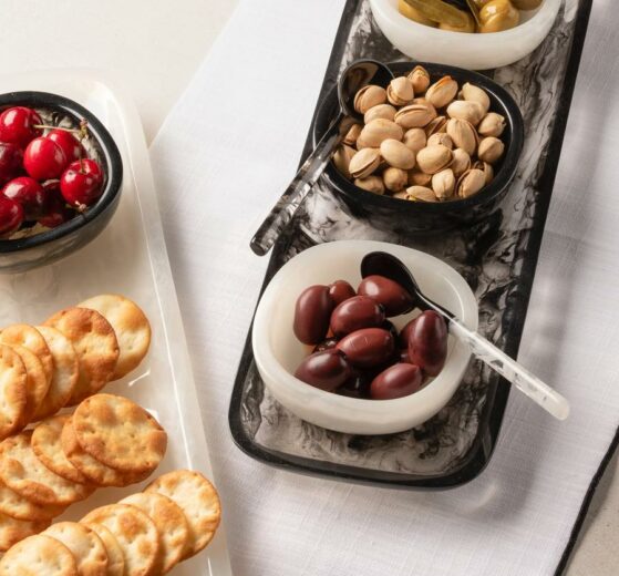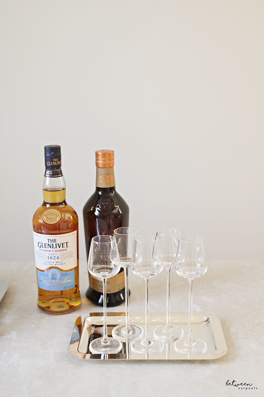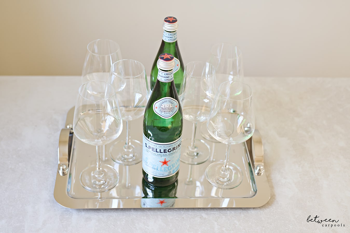 When it comes to setting up a party as such at home, I find that trays are everything. You can do so much with a tray. I use larger trays to line up the drinking glasses (see image) and smaller trays to display food. Trays keep everything neat and uniform.