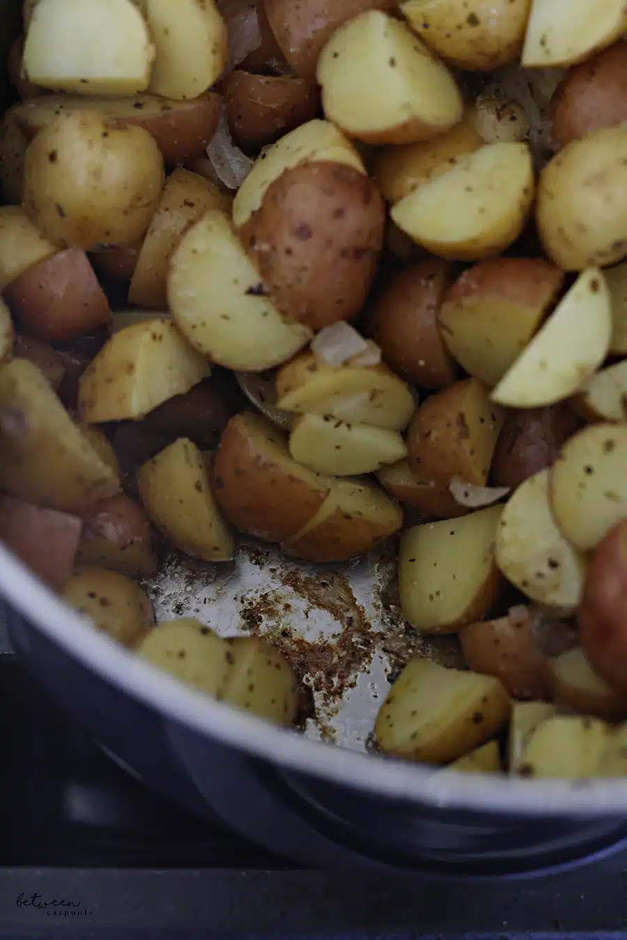 - Every 10 minutes or so, mix the potatoes well, making sure to scrape up the bottom layer. When the potatoes are fork tender, they’re ready. But you want to let the bottom layer caramelize a bit longer than that. Keep your eye on it and don’t let it burn, but the browned part at the bottom is the best part!