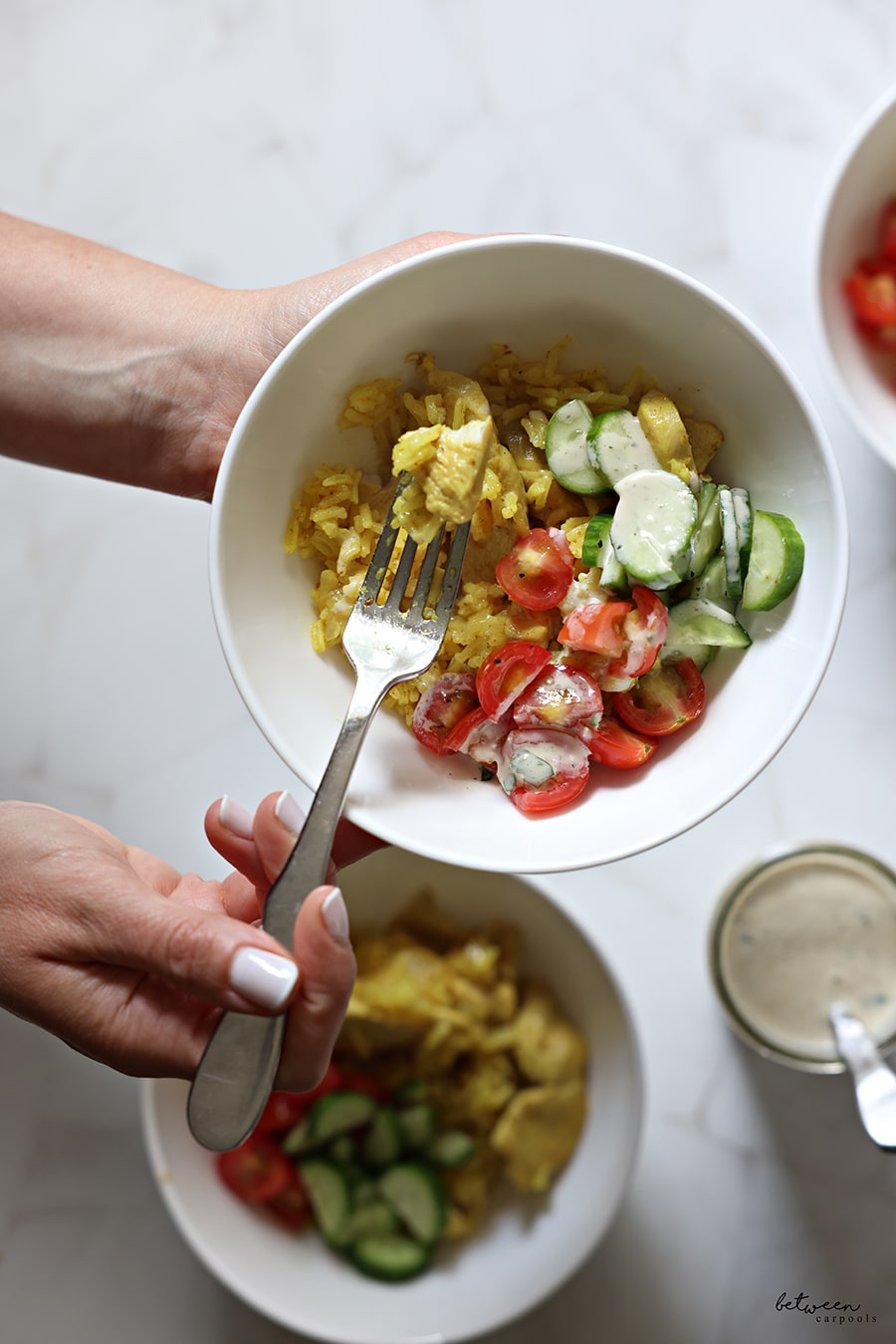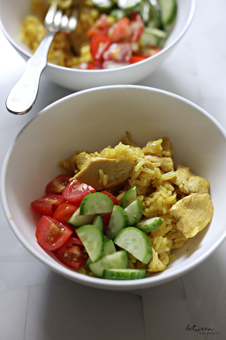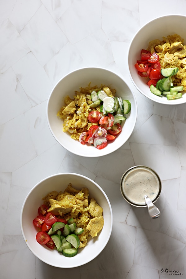 We served our chicken and rice with cherry tomatoes (seasoned with salt, pepper, and olive oil), cut Persian cucumbers (seasoned with salt, pepper and lemon juice) and some techina.