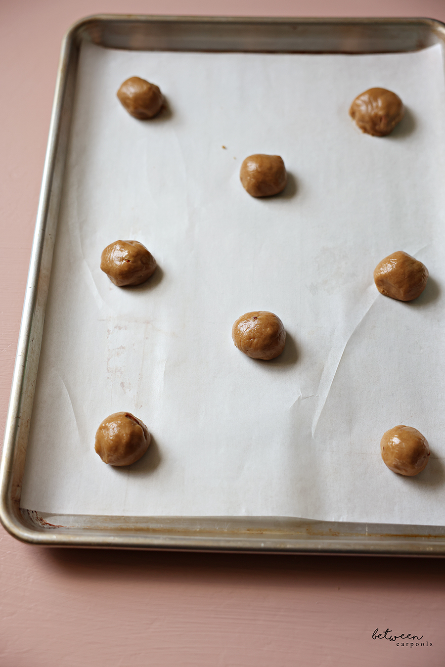 Scoop the cookie dough onto your baking sheets. We used two baking sheets with just 9 cookies per sheet as these spread a lot.