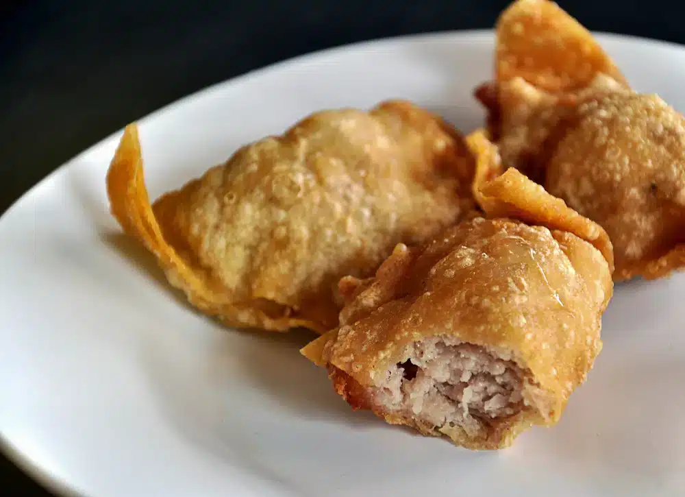 - To make the meat filling, sauté the onion in oil until soft. Place into a bowl. Add the meat, salt, pepper and garlic powder and mix well.
