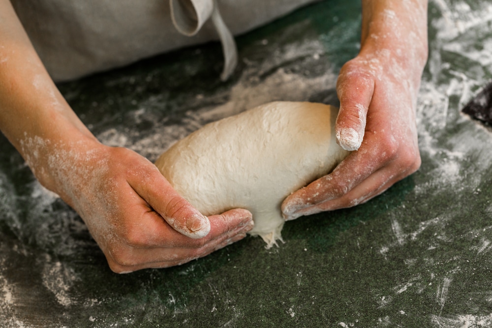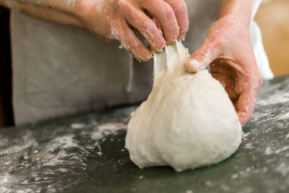 Generously dust your countertop or pastry mat with bread flour. Using a plastic scraper, transfer the dough onto the mat and you will stretch and pull the dough into itself. I bring each of the 4 corners towards the middle.