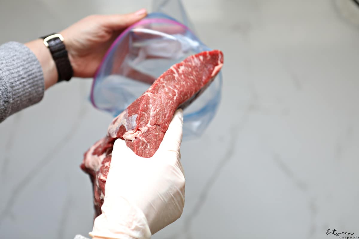 Place your London broil inside a large Ziploc bag with a sprinkle of salt and pepper, and a bit of olive oil (about a tablespoon).