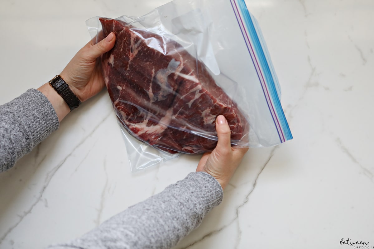 Place your brick roast inside a large Ziploc bag with a sprinkle of salt and pepper, and a bit of olive oil (about a tablespoon).