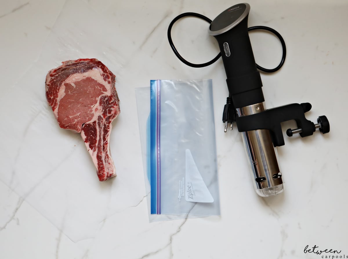 All you need to do is place your rib steak/cowboy steak inside a large ziploc bag with a sprinkle of salt and pepper, and a bit of olive oil (about a tablespoon). For a 1 ½ to 2 inch thick steak, set the sous vide to 132 ºF (55.5 celsius) for 6 to 8 hours. If the steak is thicker you leave it in longer.