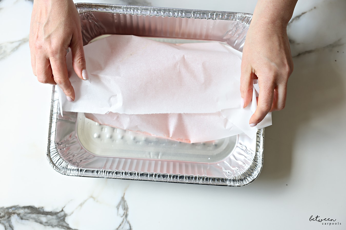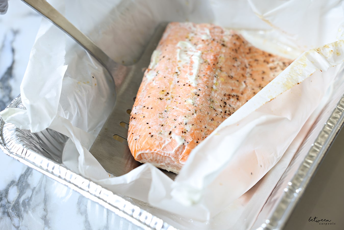 - Preheat oven to 400℉. Place the salmon in a parchment-lined 9 x 13-inch pan. Sprinkle with salt and pepper and smear with the olive oil. Cover the salmon with parchment paper and then with silver foil. This method will “poach” the fish.