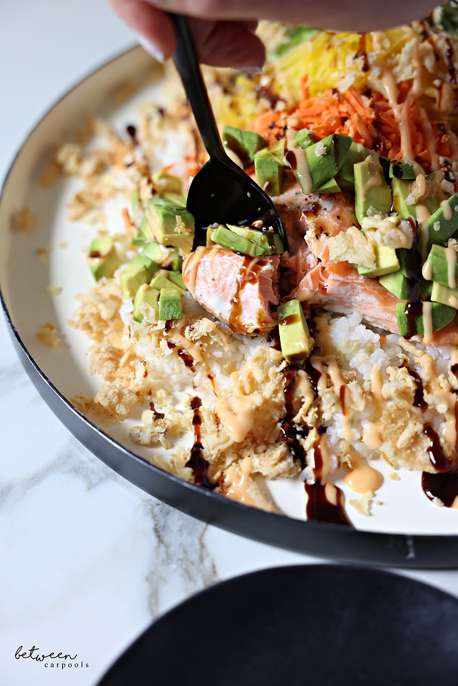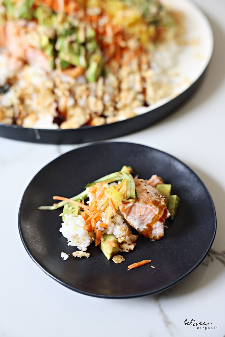 I’m looking forward to making this. So this looks like a poke Bowl and instead of cubing up the raw salmon and putting all those ingredients on top of it, you are baking yhe salmon. So you are saving the time of cubing raw salmon, and it also helps the family members who don’t like eating raw salmon