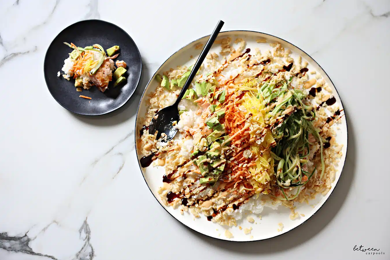 - To assemble, place the sushi rice on a platter. Top with the cooked salmon, using a wide spatula or fish spatula to help you transfer the salmon from the baking pan to the platter.