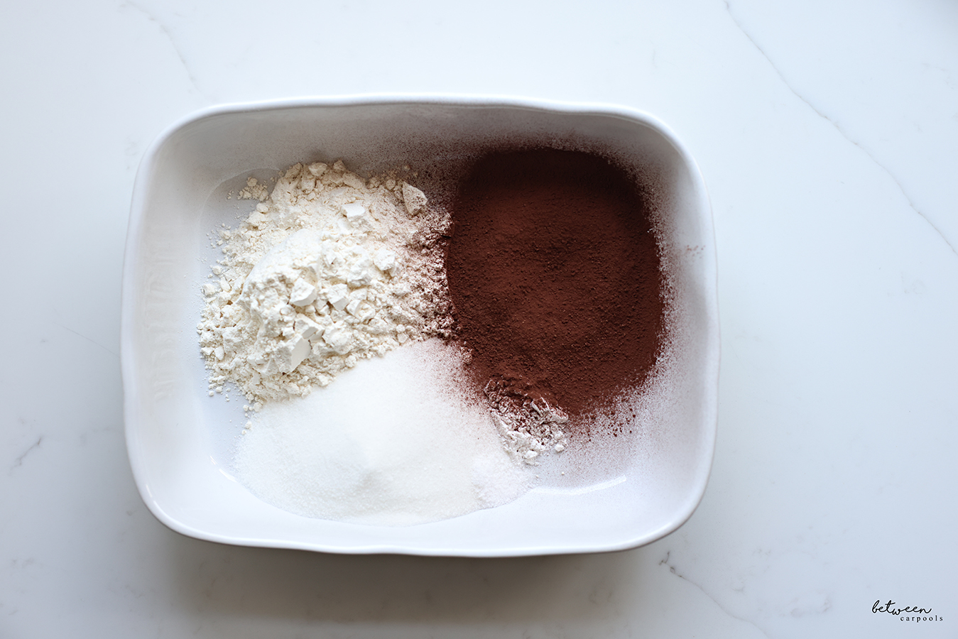 - Combine all dry ingredients in a 9×13-inch baking pan. Add milk, oil, and vanilla and mix. Batter will be thick.