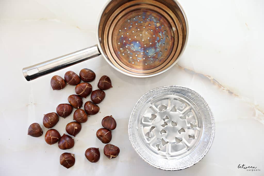My method consists of roasting the chestnuts in a pan that is really meant for steaming vegetables or to be used as a sieve, like this one.