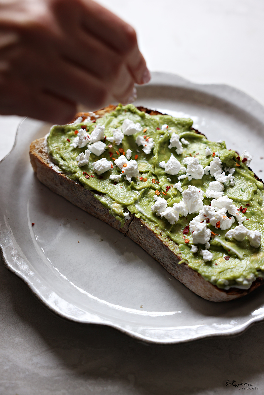Now come the little touches (that we think make a big difference). Sprinkle your avocado toast with feta cheese.
