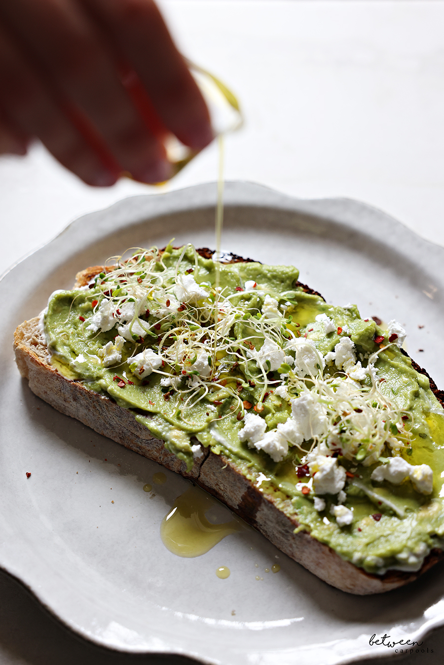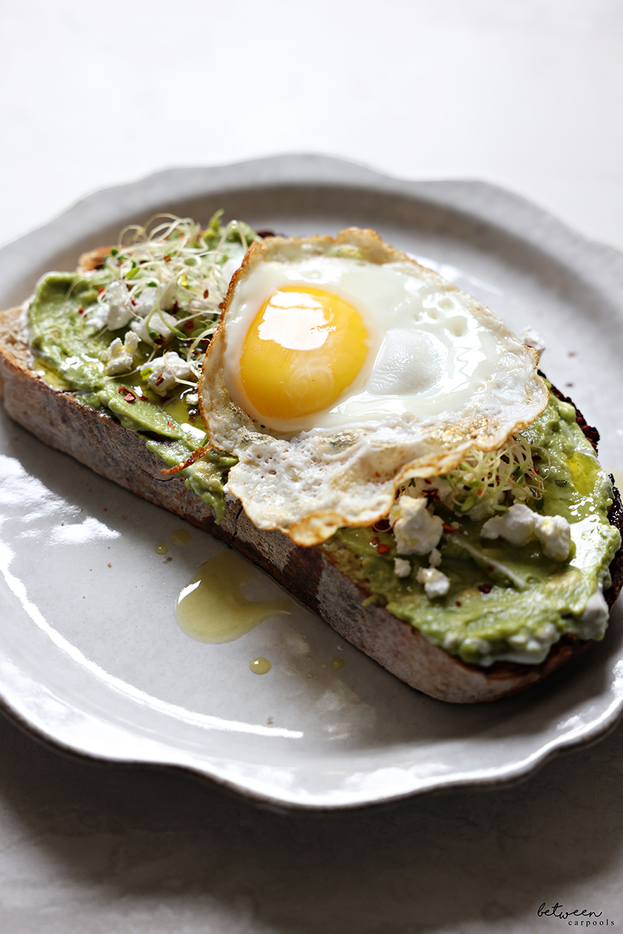 - To assemble the toast, spread hot sourdough toast with aioli. Spread with guacamole. Sprinkle with feta cheese, red pepper flakes, and alfalfa sprouts and drizzle with olive oil. Top with a sunny-side up egg and enjoy!