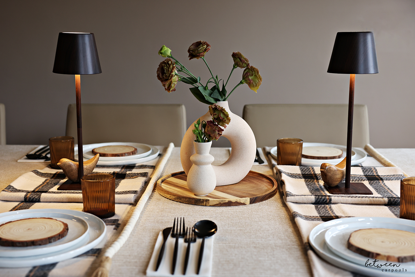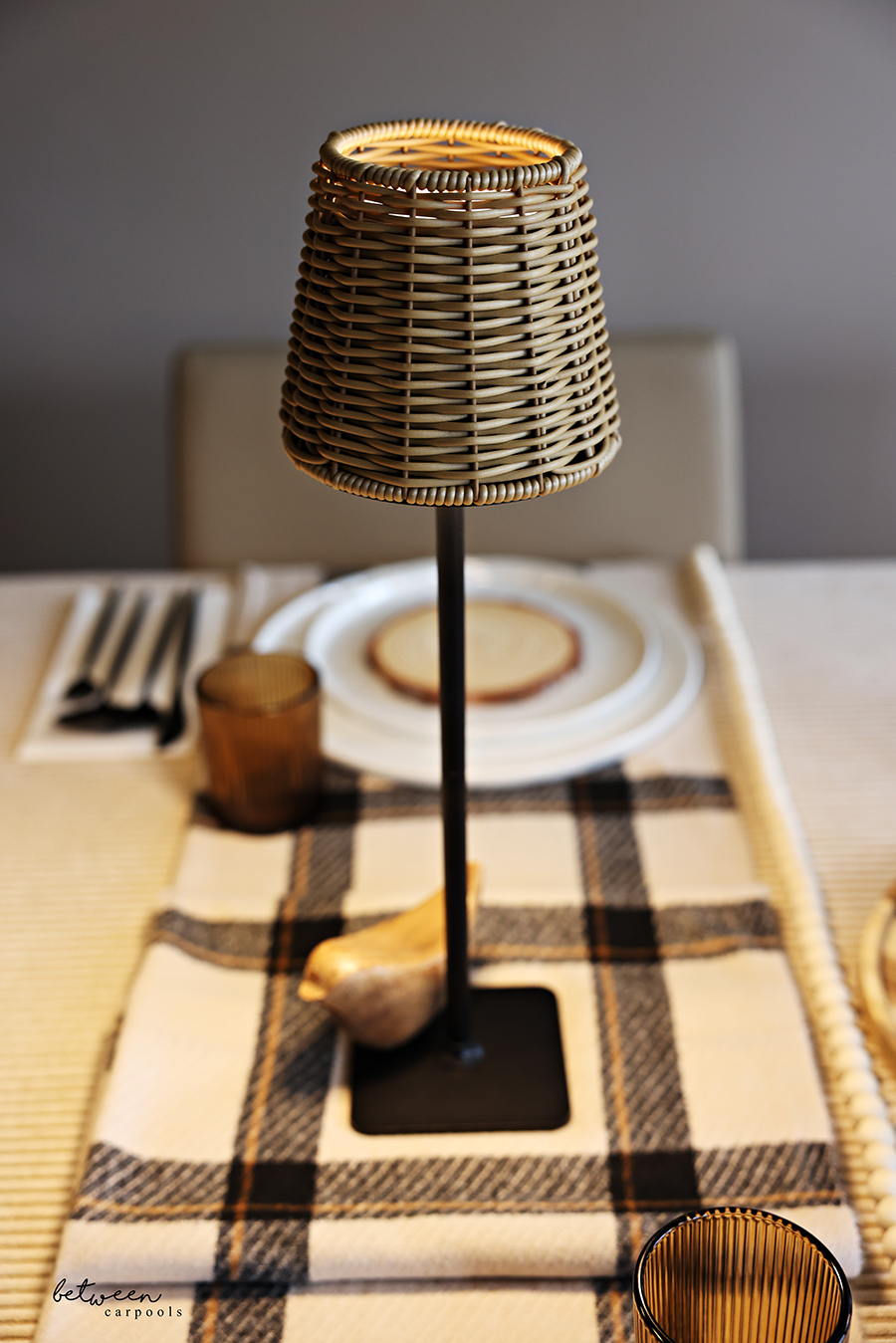What’s that plaid tablerunner? It’s scarves! But they work so perfectly to set the mood. A little bit of wood accents like these little birds adds a nice touch.