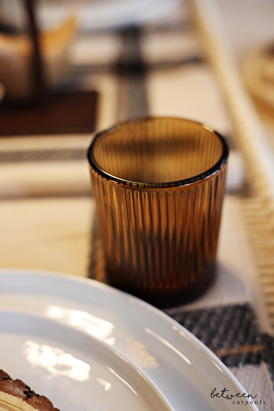 Want to use plastic instead? Luxe Party has lots of warm colors that work well in this tablesetting, including lots of beiges and browns. Featured here is the Linen Pebbled Set.