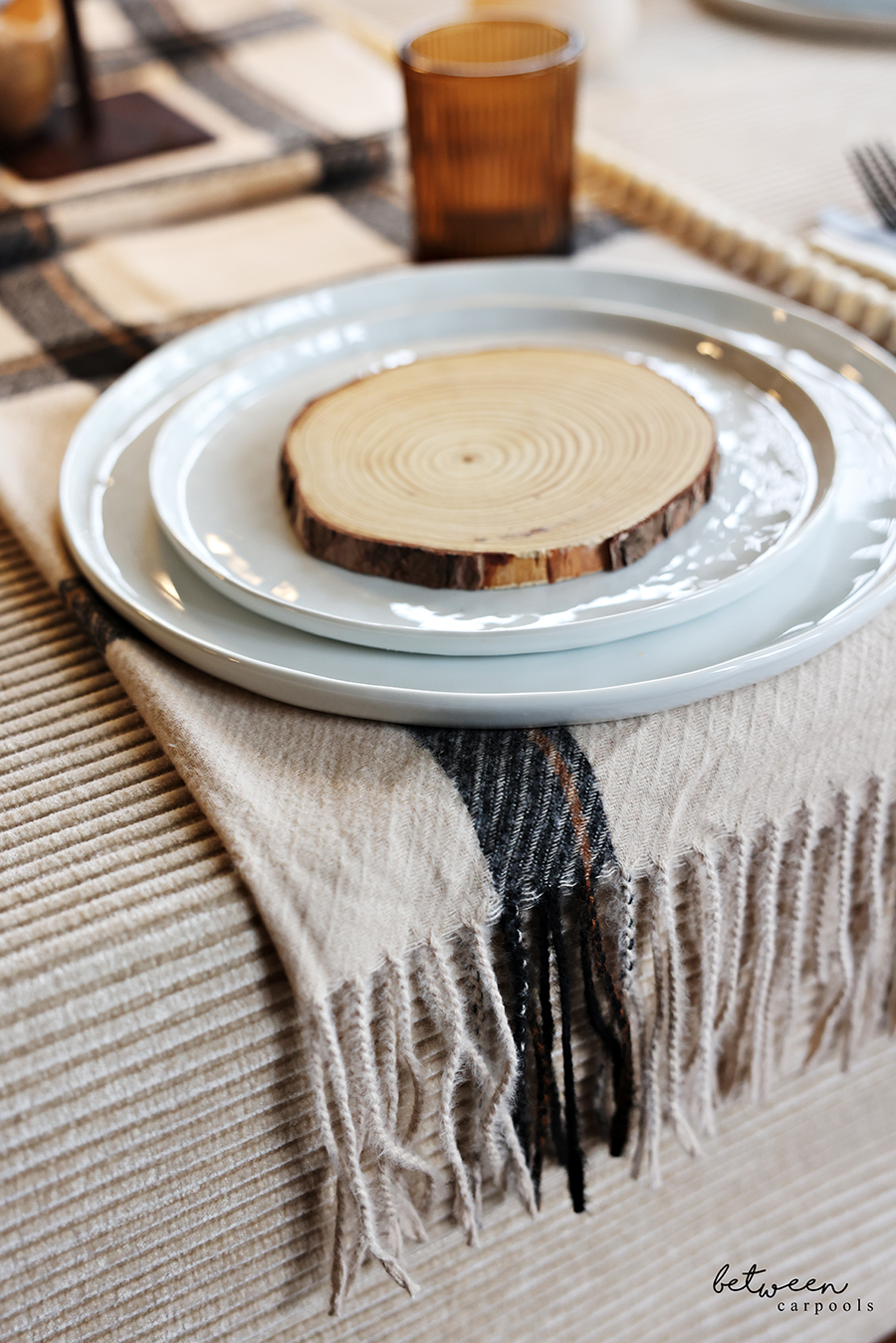 The dishes are our favorite Mercer Dinnerware from Crate and Barrel that we use every single day. These wood slices are a nice option for place card holders – add your guests names.