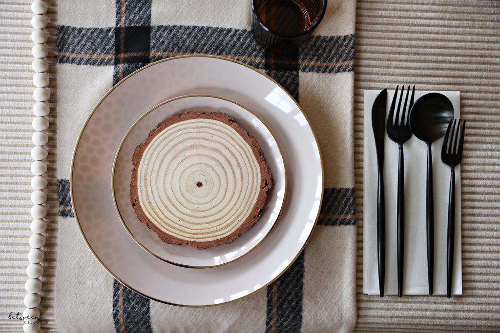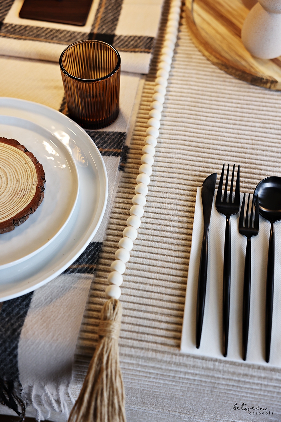 Any black flatware works well here. Additional little accents like these wooden beads with tassels are another option.