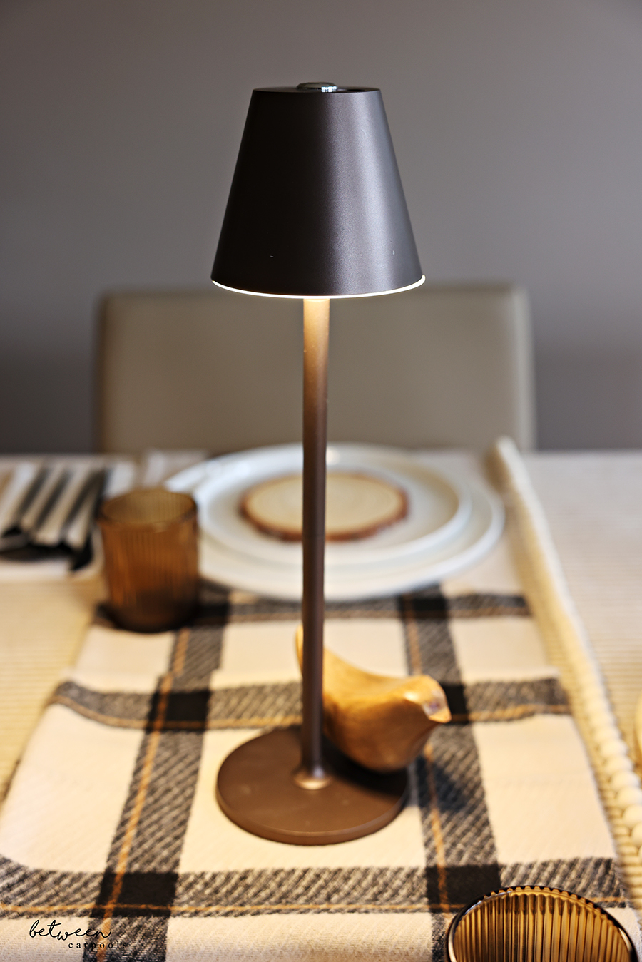 Ok, now for the details. We were initially inspired by these rechargeable table lamps that are so, so practical. It’s elegant table decor you can enjoy over and over. It’s a great way to add “light” to your table on Chanukah. Put three down the center of your table…or 8! They’re super elegant when the lights are shut as well.