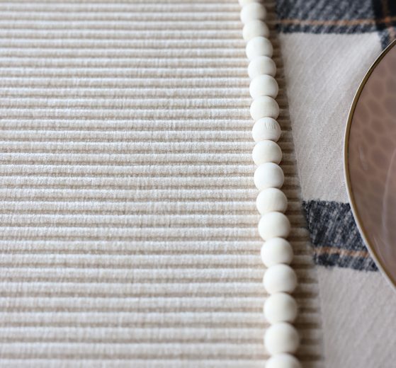 Or these with an added wicker shade option (also great for a summer look when you want to change it up). Now let’s go from the bottom up. We loved this taupe Velvet Ribbed Tablecloth so much we didn’t want to give it back after Devorah Rubin from Adorn Your Table lent it to us for this photoshoot. The Taupe Chenille is another option that would work great here.
