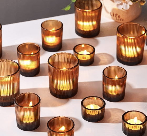 These amber votives come in a set with 3 sizes. You can use them all as votives or use the largest side as a small glass. Use this as inspiration, mix and match some new accents with those you already own and enjoy a warm, cozy winter night with your family and guests.