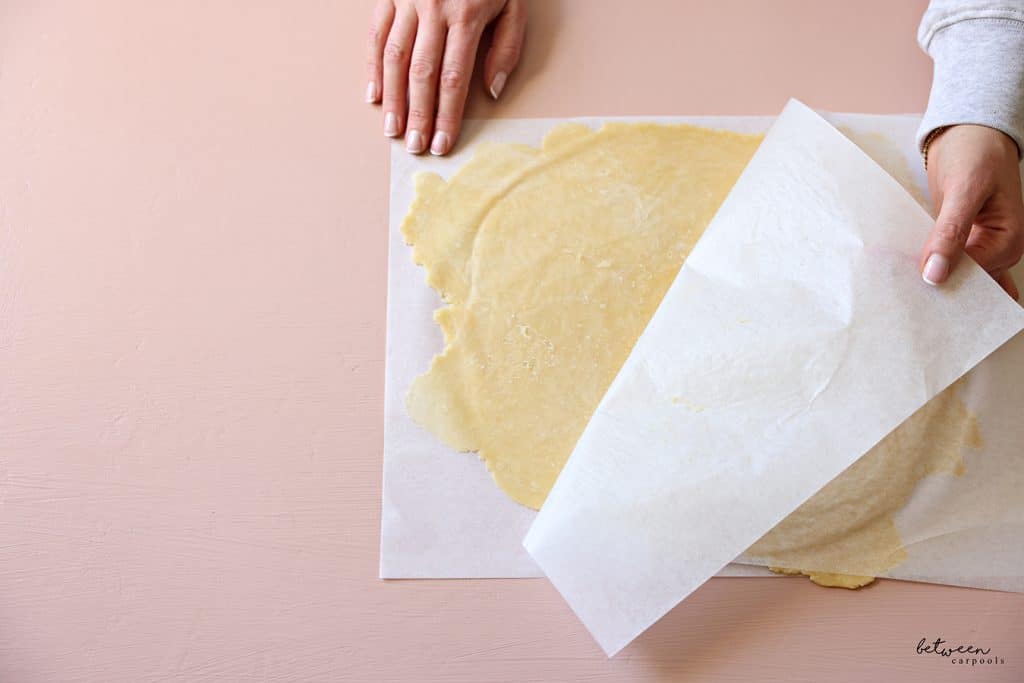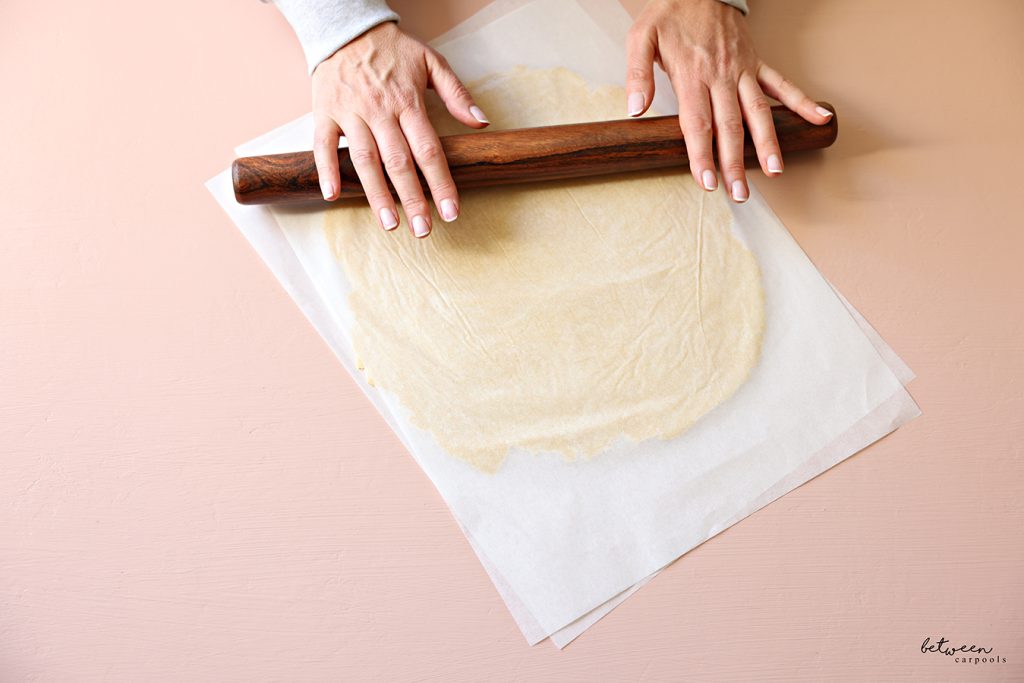 Place the dough between two pieces of parchment paper and using a rolling pin, roll out dough.