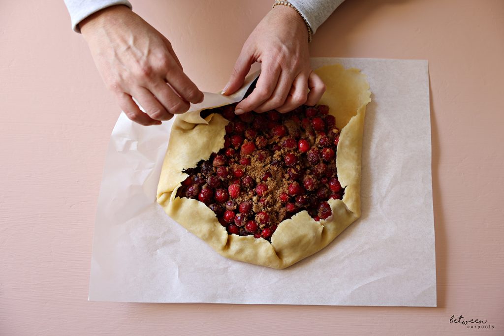 - Pour the fruit in the center of the rolled out dough, leaving a 2-inch border. You can use your hands to spread out the fruit and kind of cluster it with some height onto the center. Using the parchment paper to help you, fold up the edges of the dough over the fruit and pinch into pleats.