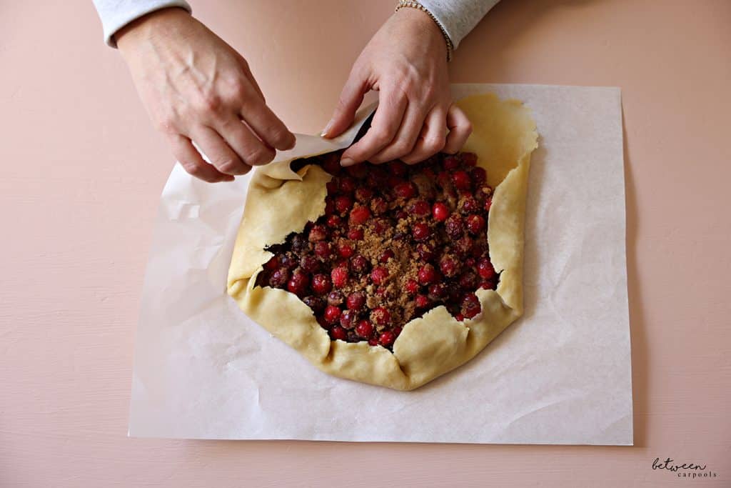 Using the parchment paper to help you, fold up the edges of the dough over the fruit and pinch into pleats.