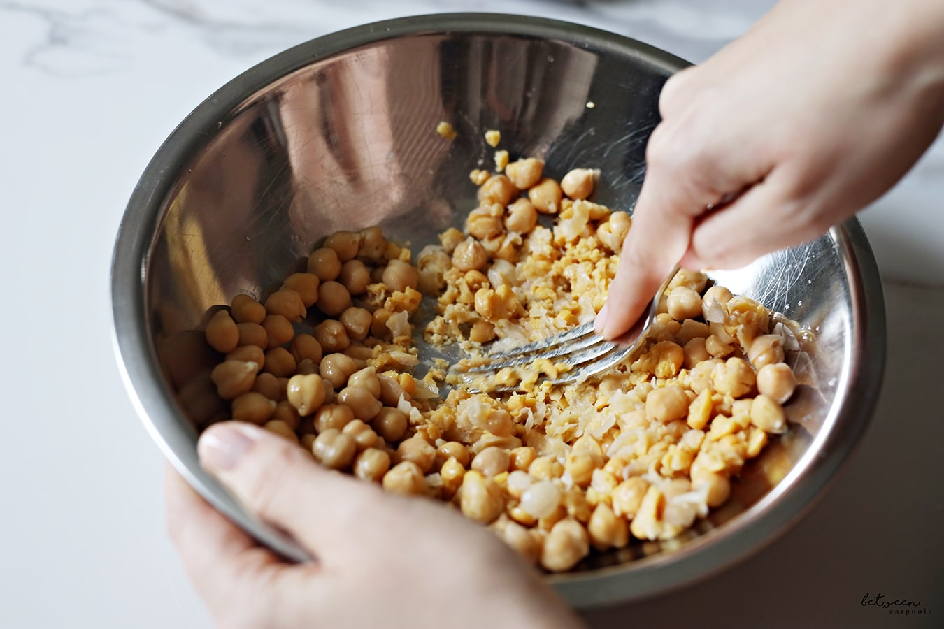 - Using a fork, mash the chickpeas with water, lemon juice, oil, and spices. Once mixture is coarsely mashed, mix in cucumbers, tomatoes, and onions.
