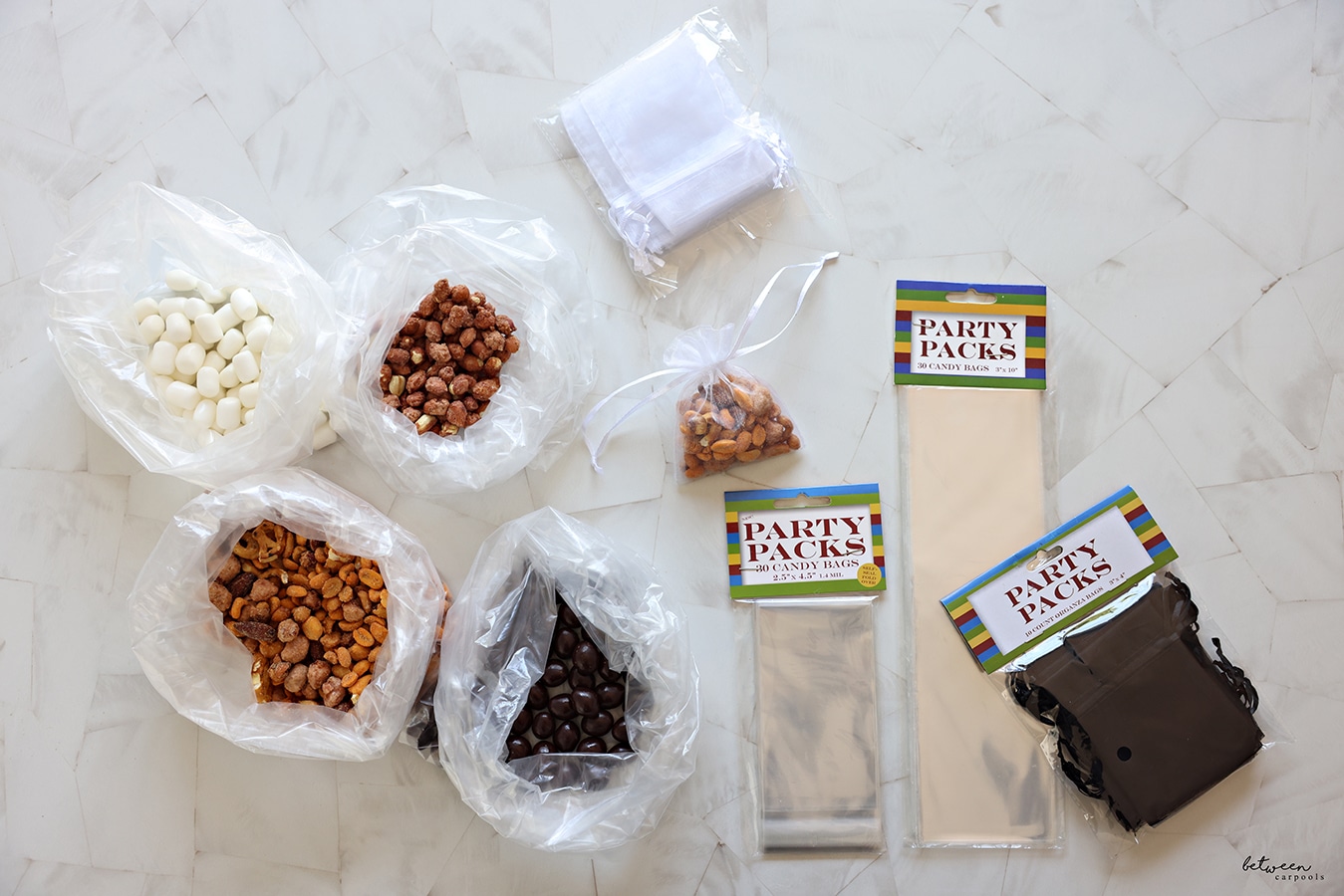 Each food item needs additional packaging because you can’t just throw nuts and candy into the box, so there’s more measuring and more container buying–does this bag fit, does that container hold enough chocolate? Then the rolling water bottles…we used to glue dot them down, only to find that the glass bottles weighed the box down on one side.