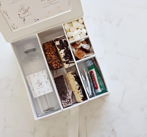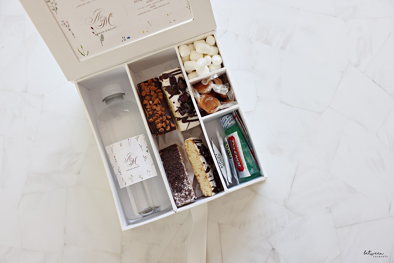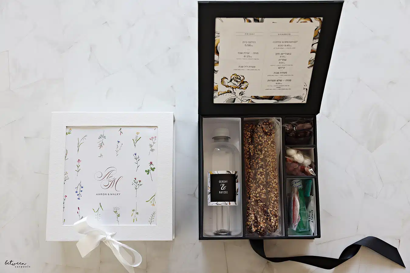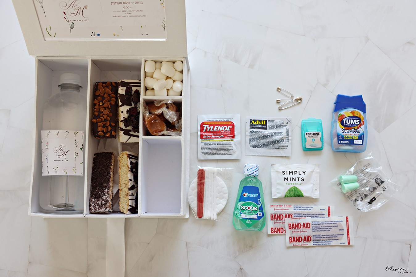 Why is a hostess box so important? It’s the touch that makes your guests feel welcome. When people are traveling, either from out of town or simply from across the neighborhood, they’re leaving the comfort of their homes to celebrate your simcha. It’s nice to provide them with the simple conveniences that they might not have easy access to in their accommodations (look at our photos for ideas!).