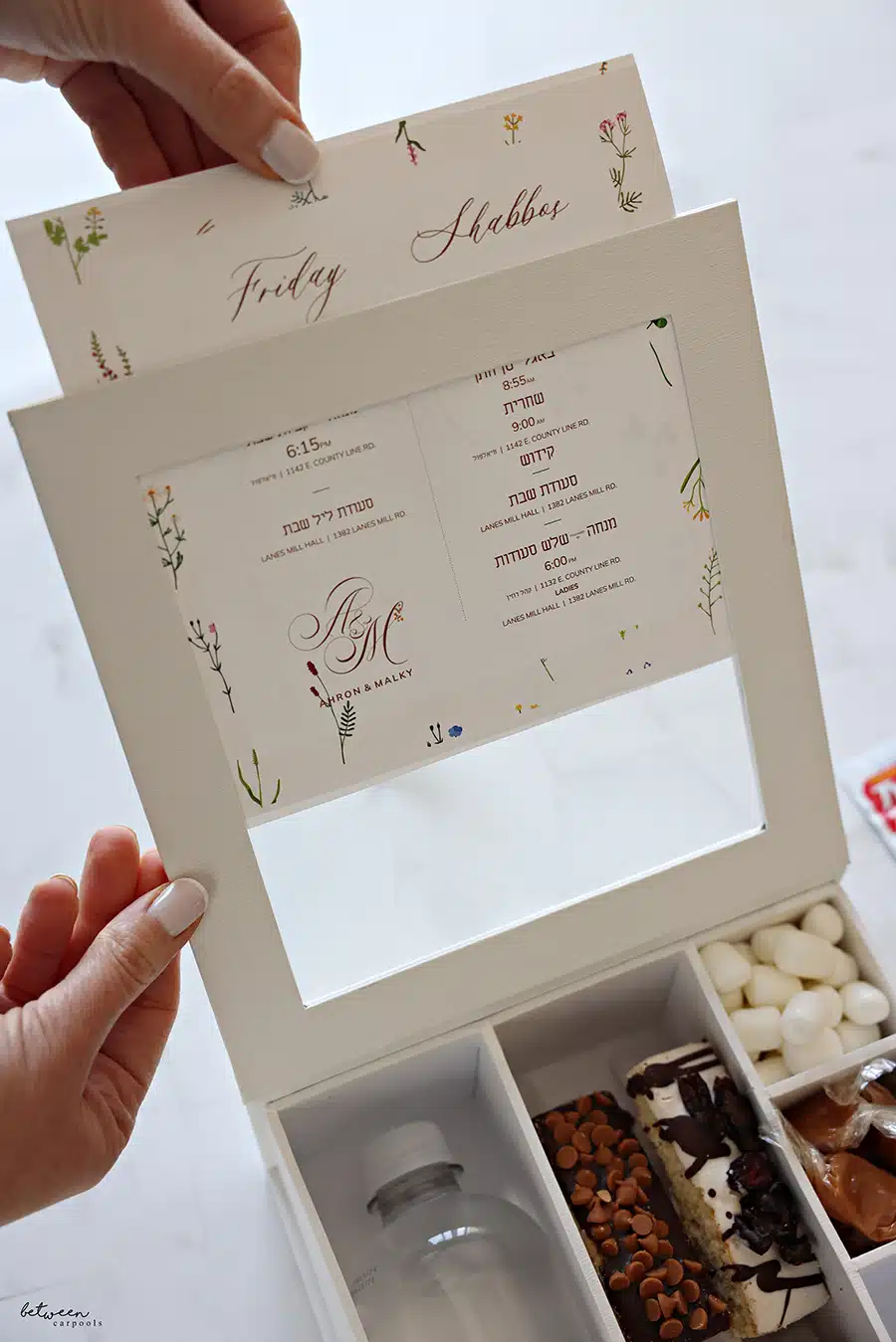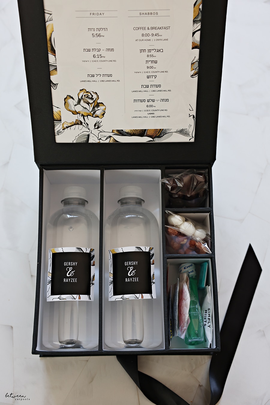 It can just be some bottled water and nosh…or be a little more detailed and include the toiletries they may need. Another important aspect of the hostess box (perhaps the most important!) is the itinerary of your simcha–all the times/locations of davening and meals!