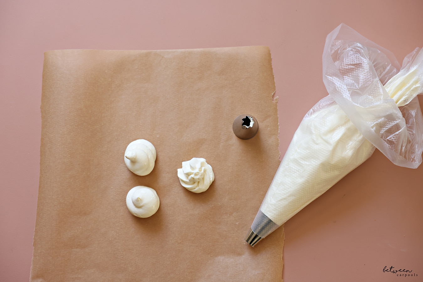But what about when you do actually need to use a tip? (Like when we make these meringues, for example). Chances are, even if you don’t use a piping bag all year, come Shavuos, you might be using one to make your desserts or that cheesecake just a little prettier than usual.