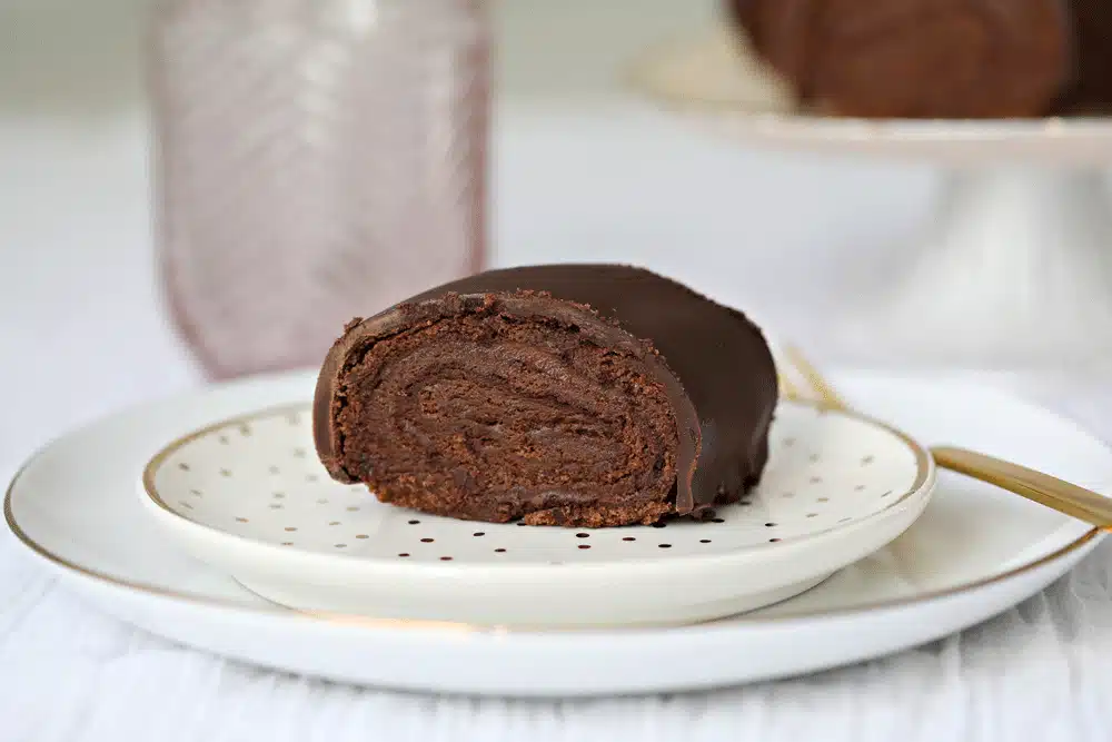 After spreading the mousse on the cake, roll tightly and then wrap tightly in plastic wrap. Freeze for 6 hours or overnight. Then decorate as desired (coat in chocolate or spread remaining mousse on top; cut on a diagonal for nicer presentation.)