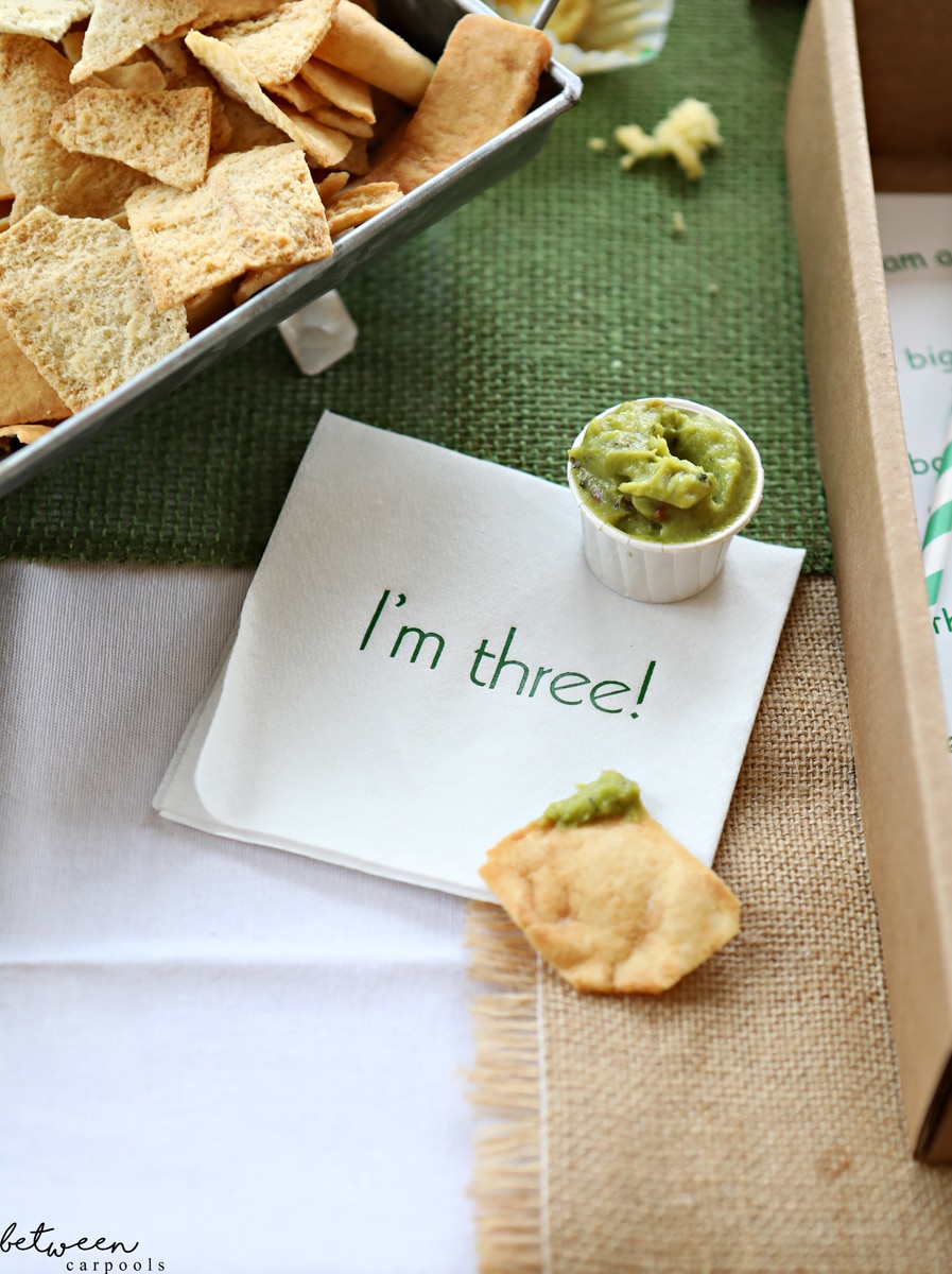 I filled little buckets with precut parchment paper to serve the chicken. Another important and cute component were these mini dip cups, which I filled with mustard and ketchup. Every little detail adds cuteness.