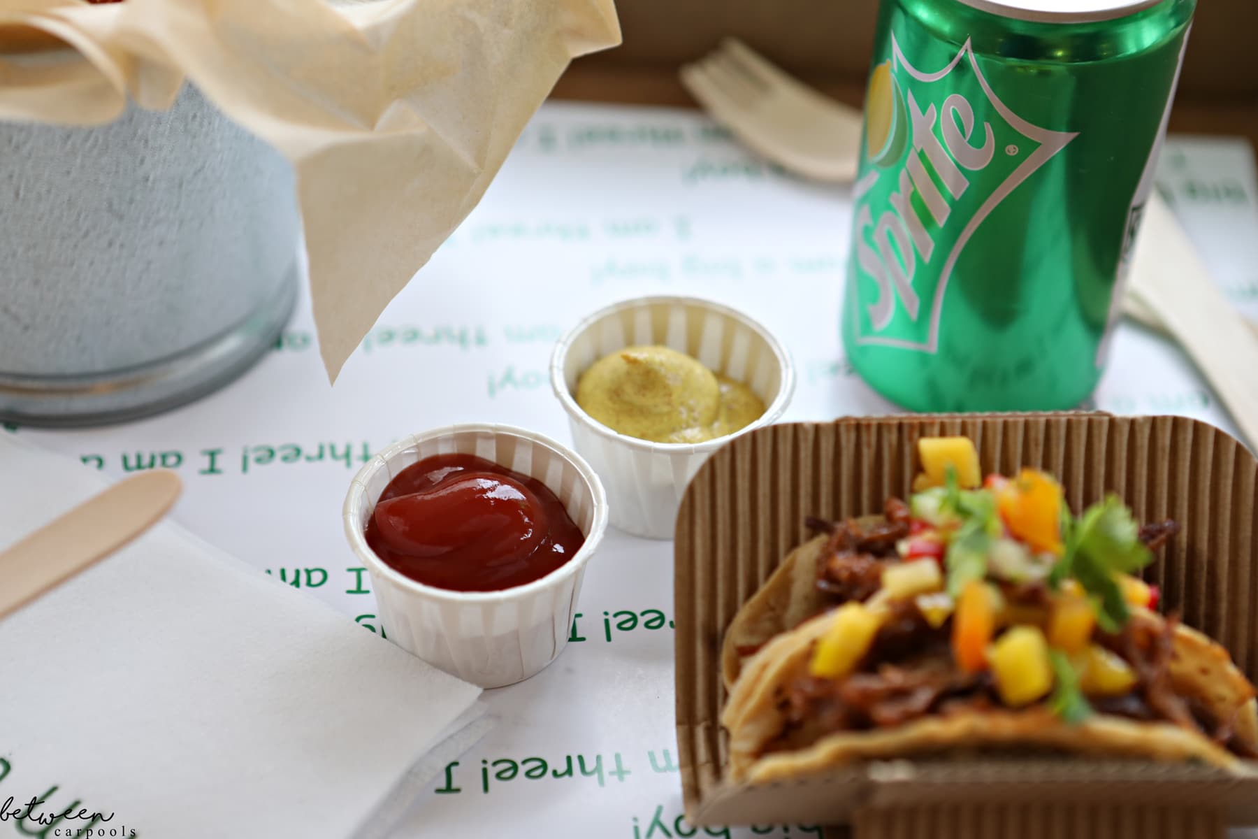 After that station, one could find a lineup of ready to grab tacos, ingeniously standing on these adorable and disposable cardboard taco stands. I had prepared traditional taco meat and also this shredded beef with salsa (click here for link to a winning recipe.)