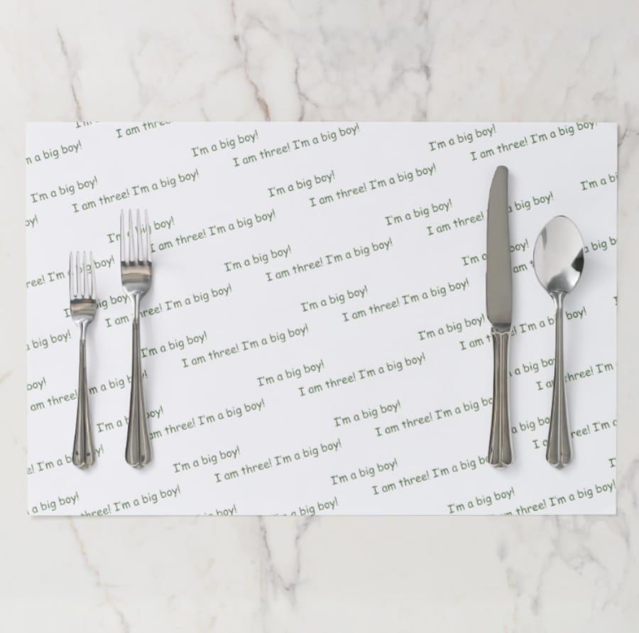 I had a local stamp store print papers to place inside the trays. I preferred not writing my son’s name there but just “I am a big boy…etc.” since all these placemats end up in the trash. It always hurts me to see a kid’s name go to the trash. The same goes for the napkins; I opted on not putting the name there too.