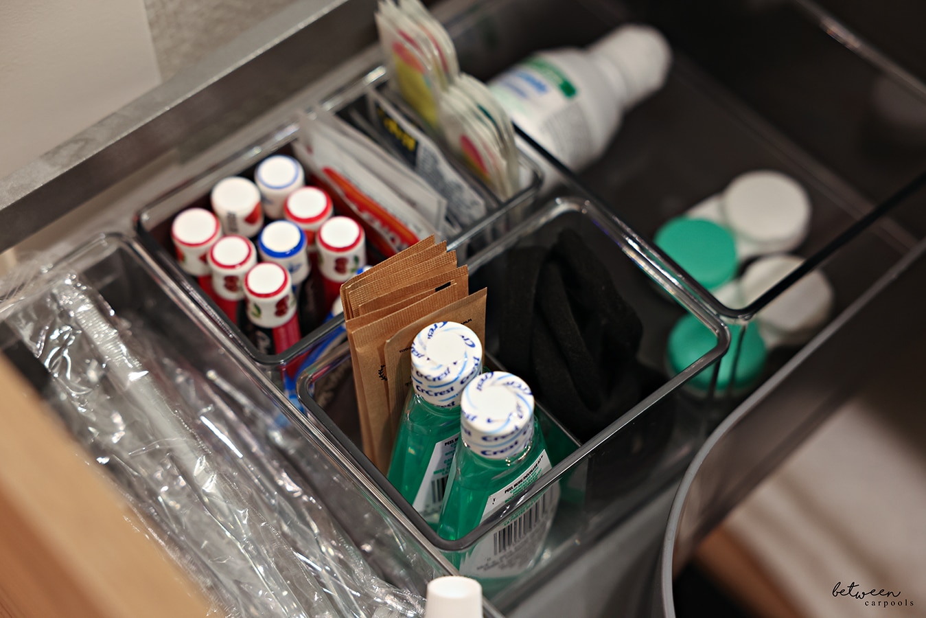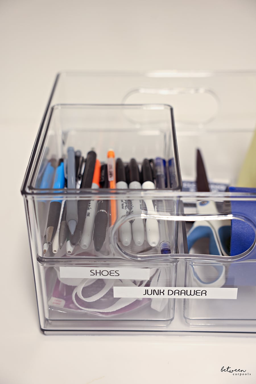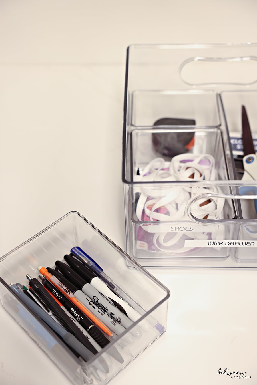 In this “junk drawer” bin, I was able to stack the pens on top of the bin that holds shoe products because those aren’t used all that often.