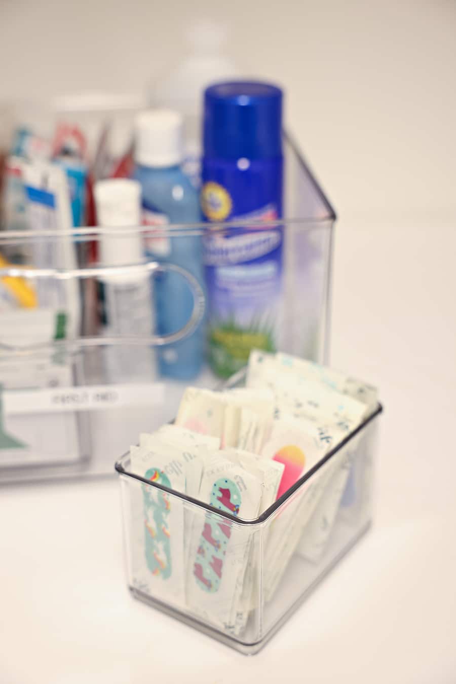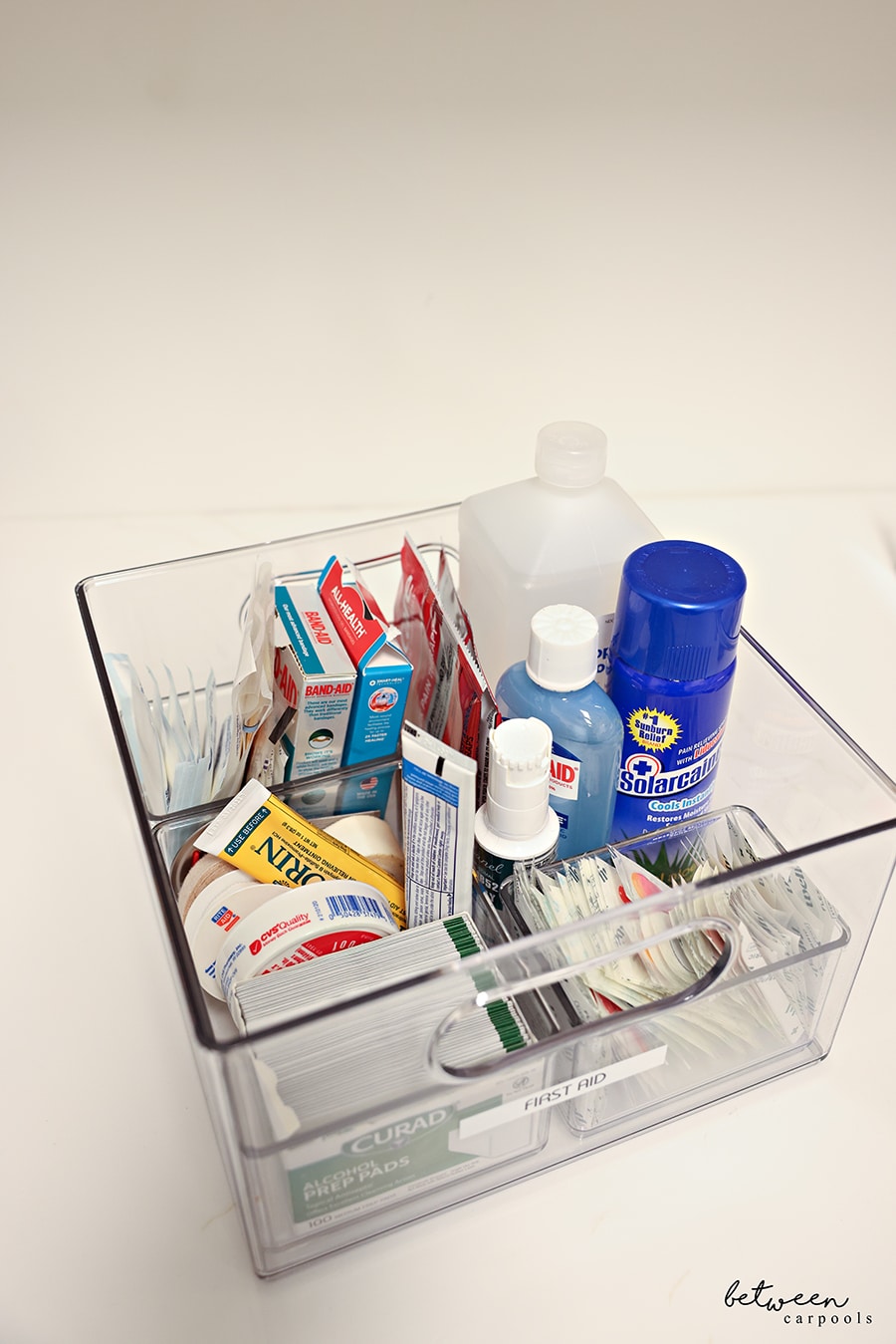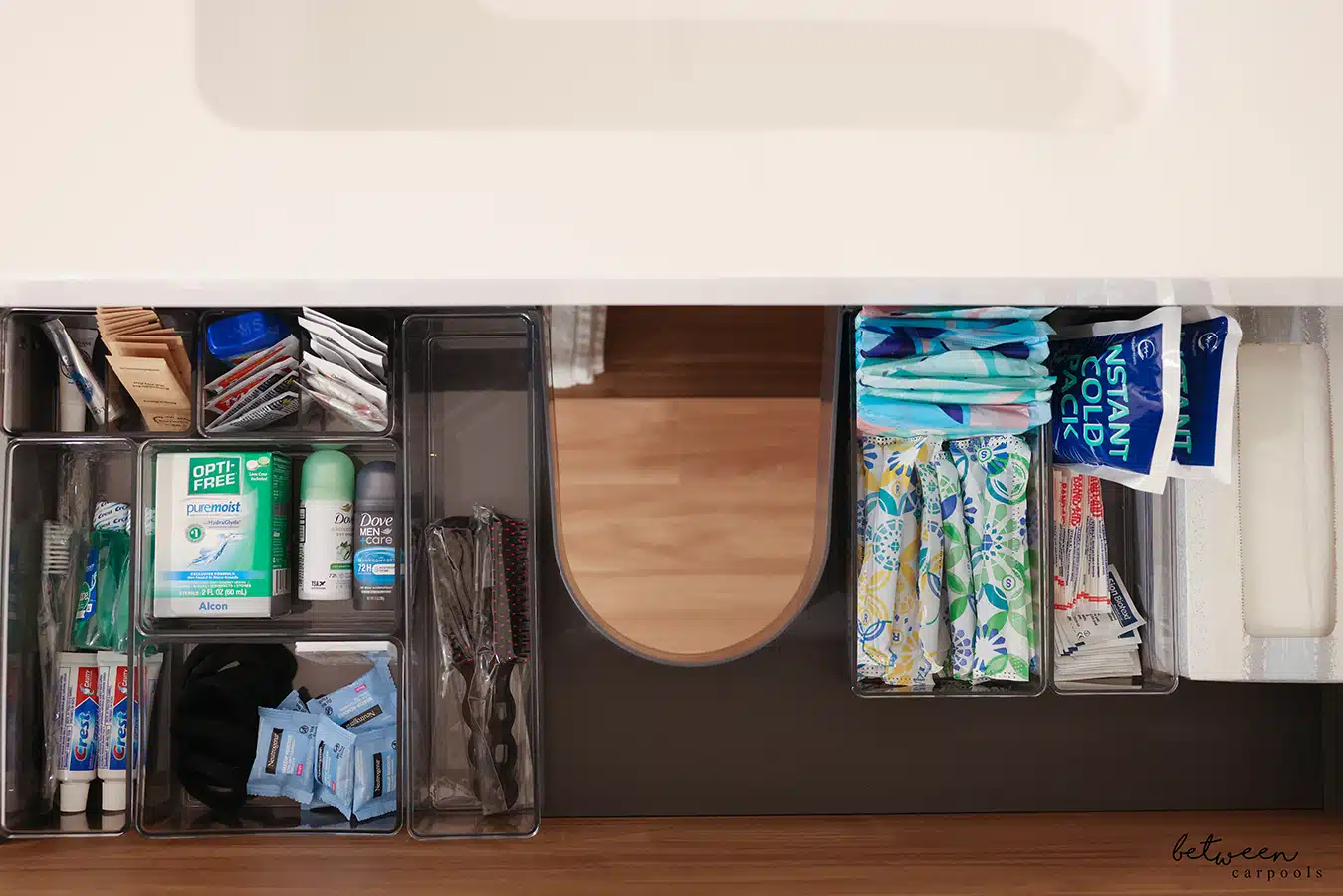 In this “junk drawer” bin, I was able to stack the pens on top of the bin that holds shoe products because those aren’t used all that often.